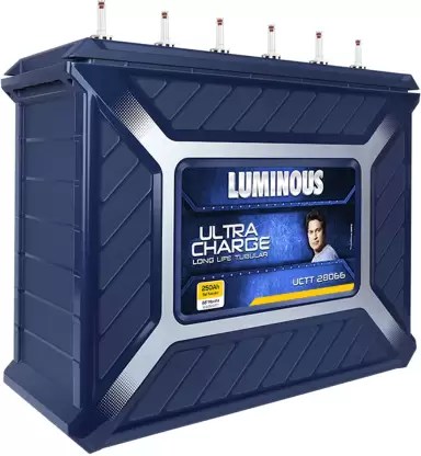 Capacity – 250 ah. The Ultra charge range of batteries are the most premium batteries from Luminous Cadre. These Tubular Technology batteries come in a rugged aesthetic container. It boasts extra safety and ultimate performance under extreme circumstances. It is designed for longer back-up time with fast charging and ultra-low maintenance.